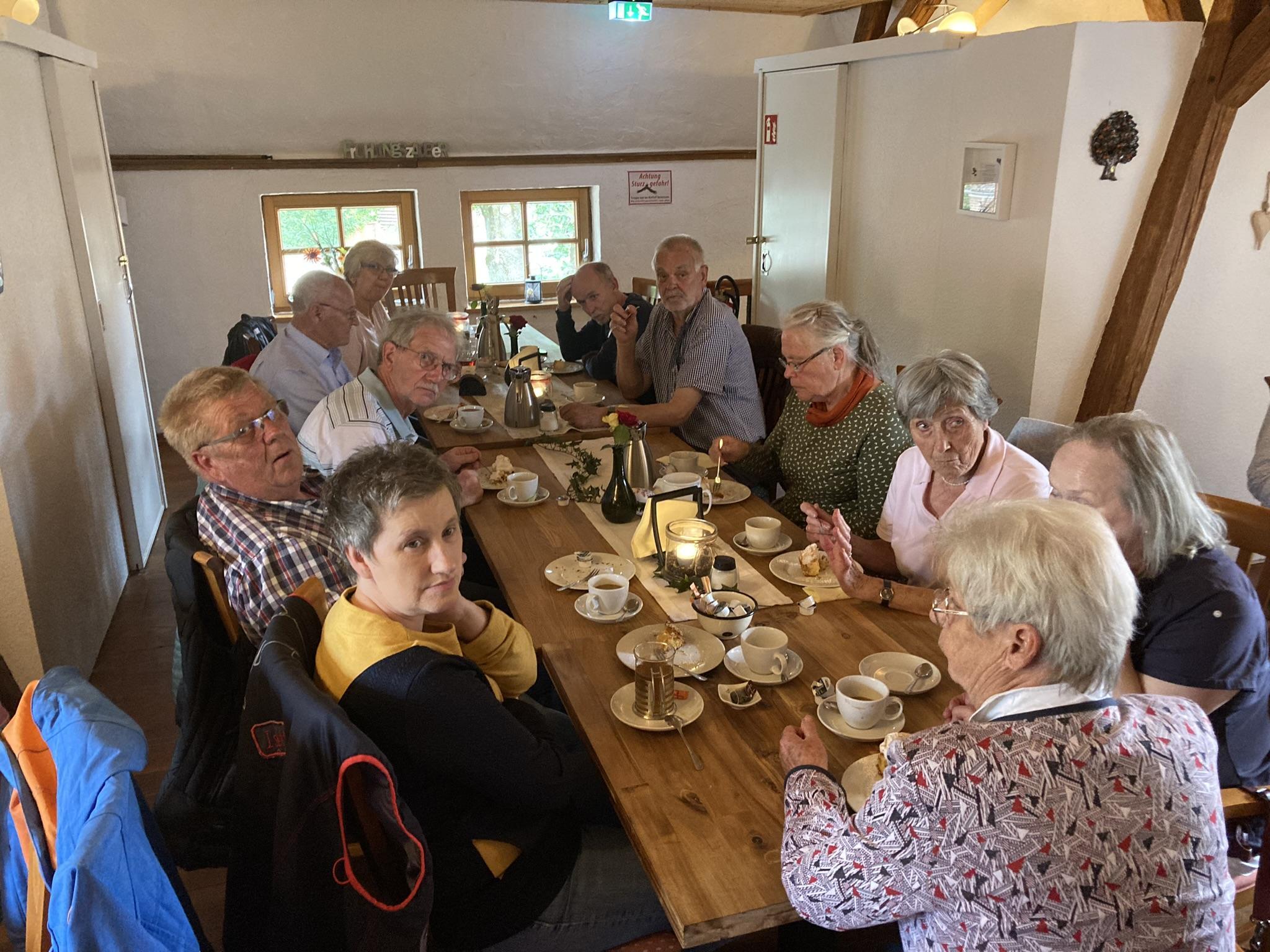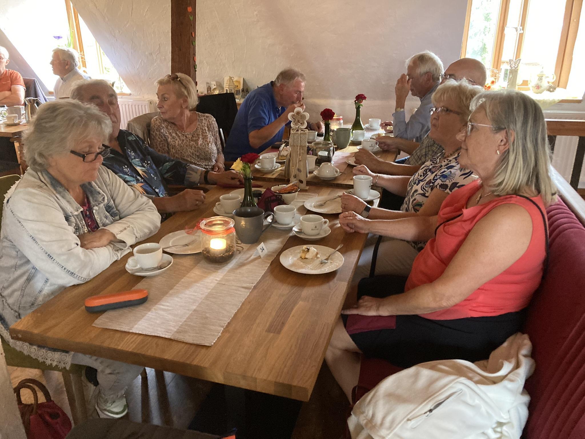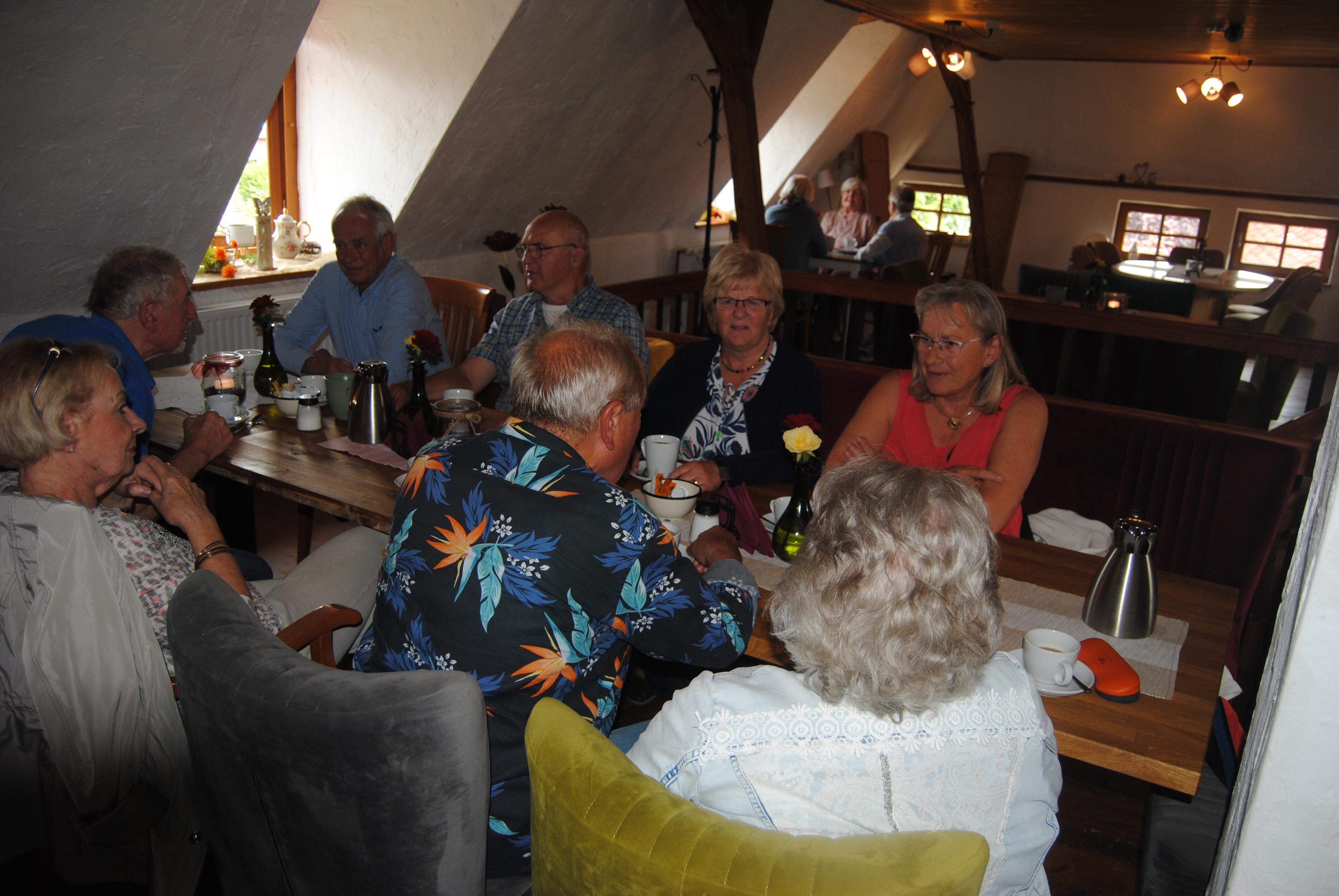 Nach dem alle sich satt gegessen hatte, brachen wir um 14 Uhr mit unseren Fahrzeugen wieder auf. Die zweite Route führte uns dann über Brokeloh nach Rehburg. Dort ging es dann weiter über Nebenstrecken nach Mardorf, Schneeren, Bohlsehle nach Husum, Schessinghausen, Leeseringen nach Estorf. Im Kaffee am Storchennest trafen wir dann um 15 Uhr ein. Für den Club war die obere Etage reserviert. Hier gab es dann für alle Kaffee satt und Torte und Kuchen.