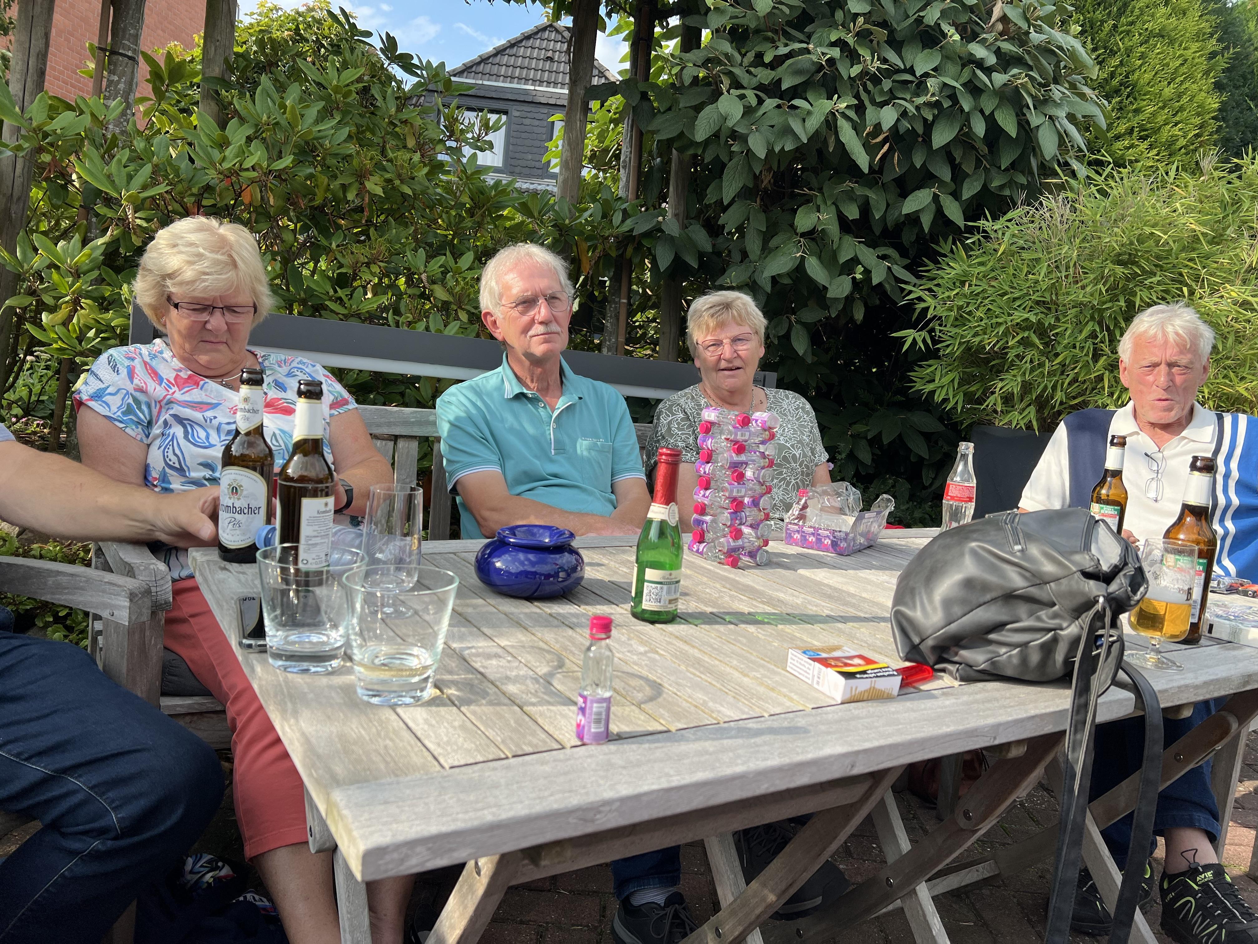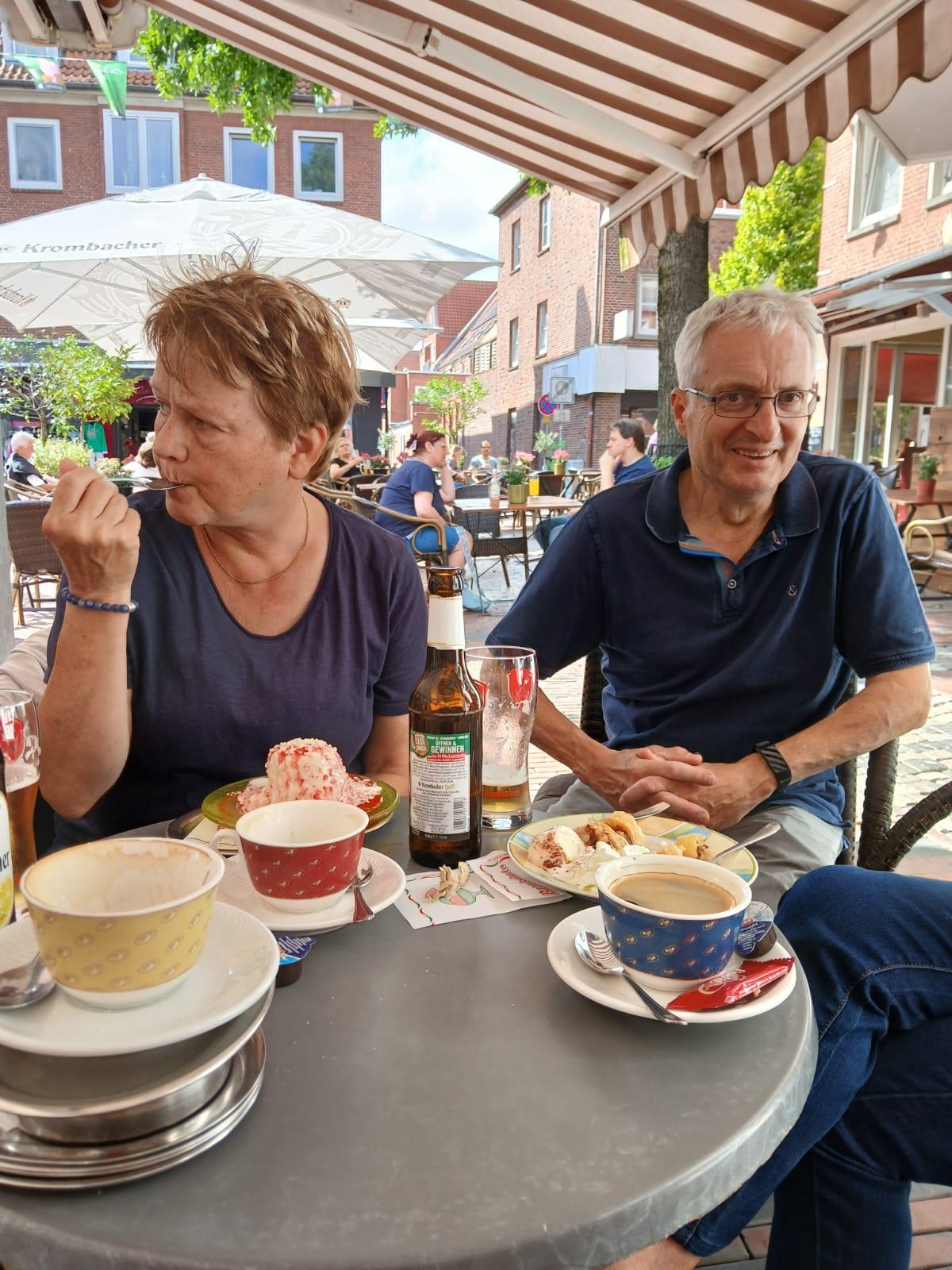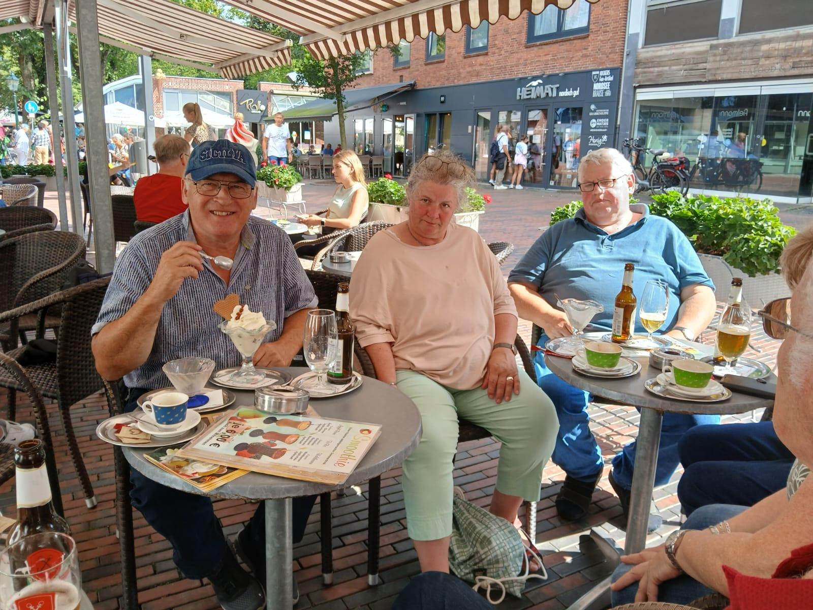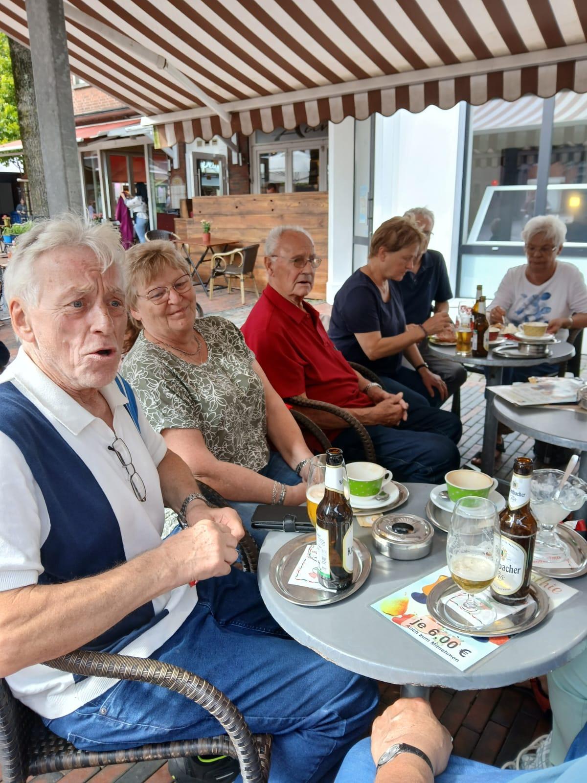 Nach ca. einer halben Stunde wurde die Fahrt fortgesetzt. Der nächste Stopp war in Dreibergen am Zwischenahner Meer geplant. Eine Anfahrt mit Hindernissen. Aber kein Problem für Elke und Manfred. Das Navi führte uns durch Feld, Wald und Wiesen. Wieder auf unserer normalen Route kam die nächste Umleitung. Wir waren mitten im Triathlon gelandet. Wieder eine Umleitung, jetzt mit Ansage nach Dreibergen. In einem kleinen Kaffee konnten wir unseren Kalorienhaushalt aufbessern. 45 Min. Pause. Weiter ging es Richtung Westerstede, Portsloge, Wadenburg, Huntlosen, Aschenstedt nach Harpstedt, Bassum, auf der B6 Richtung Bruchhausen-Vilsen nach Wöpse.