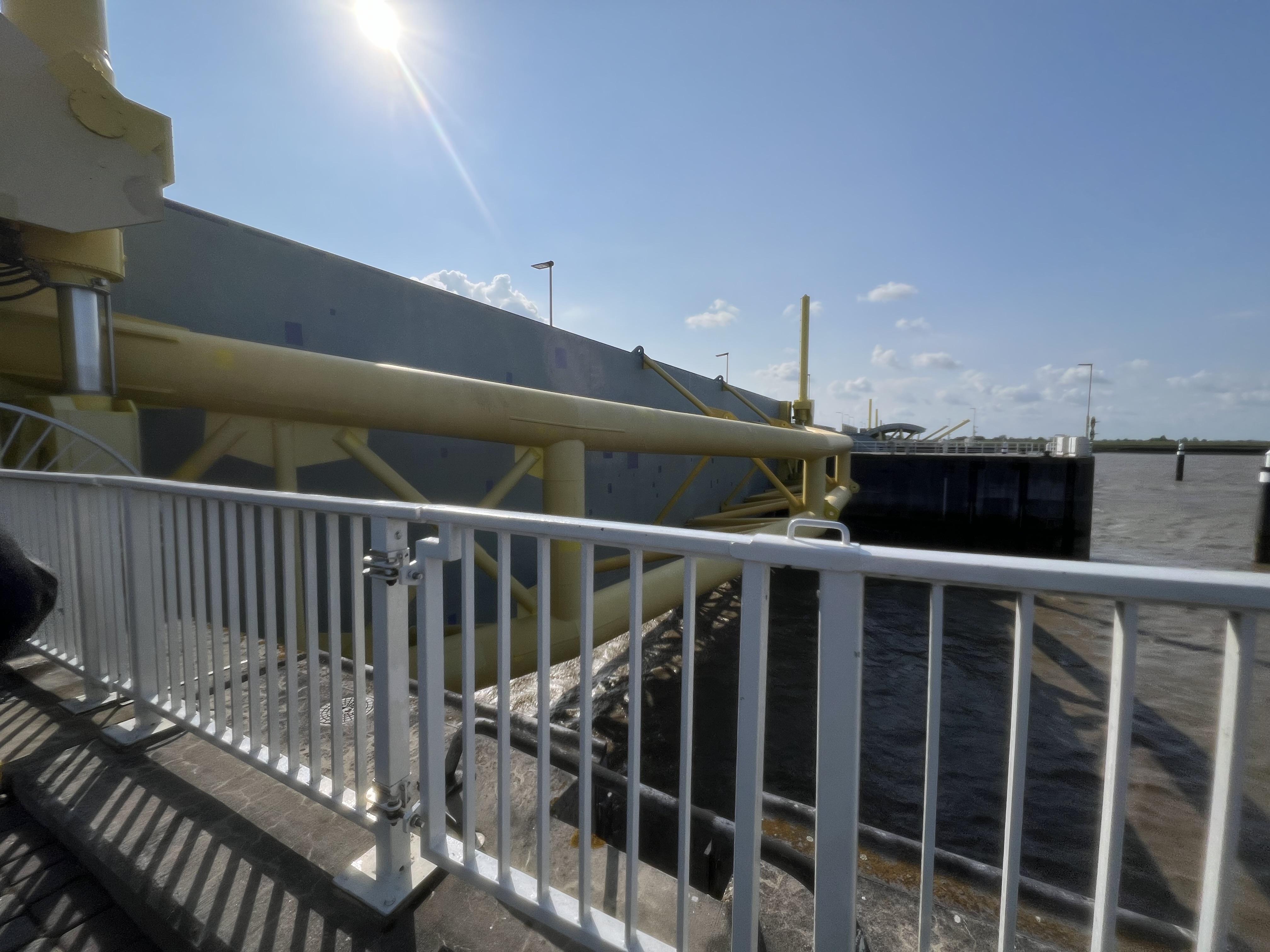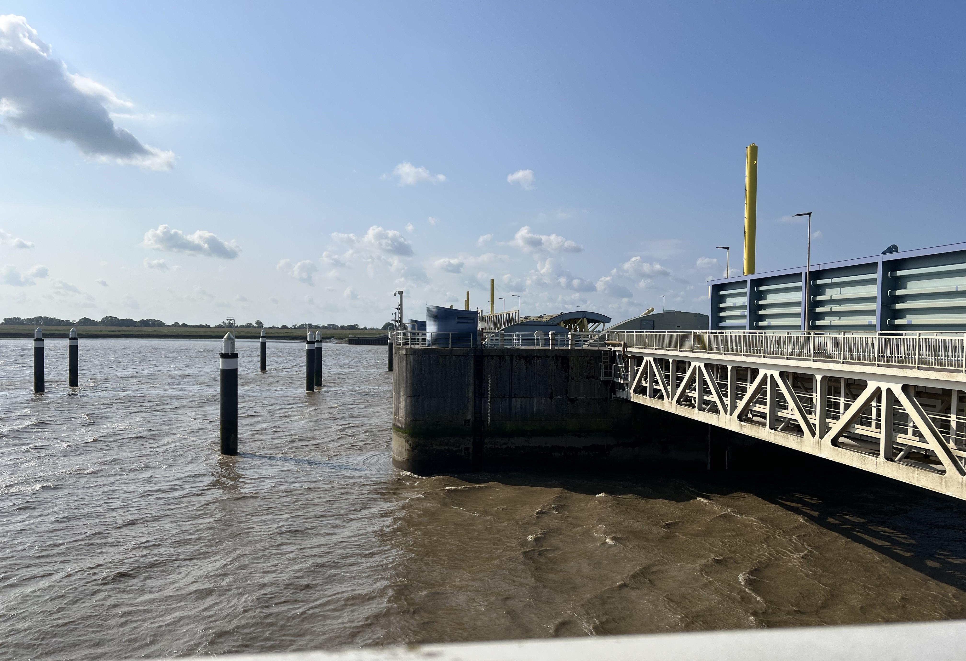 Unser erster Stopp war beim Emssperrwerk. Nachdem wir täglich dran vorbei- gefahren sind, dürfen wir es endlich auch sehen. Alle hatten die Möglichkeit, sich über das Bauwerk und seine Dimensionen zu informieren.