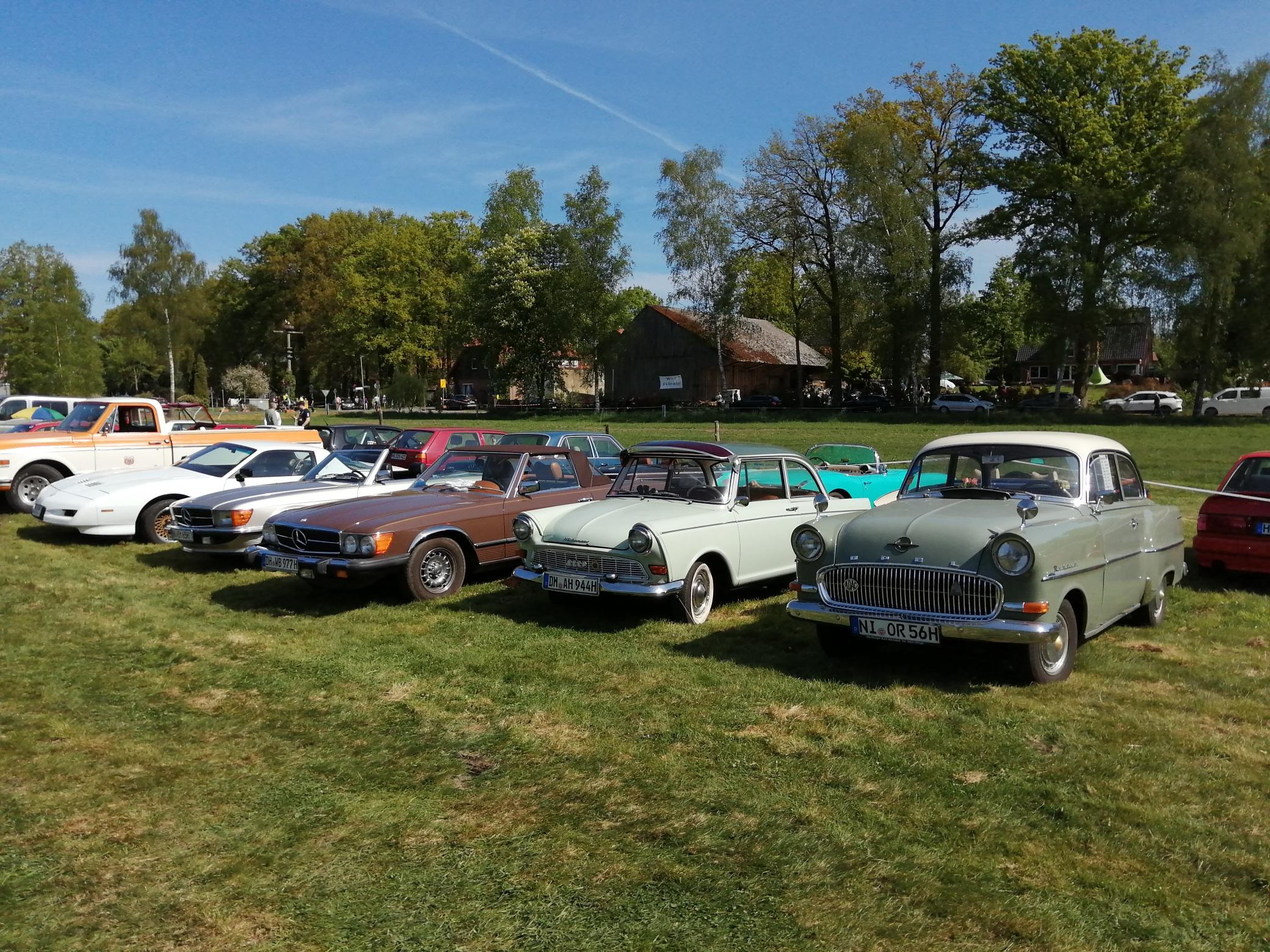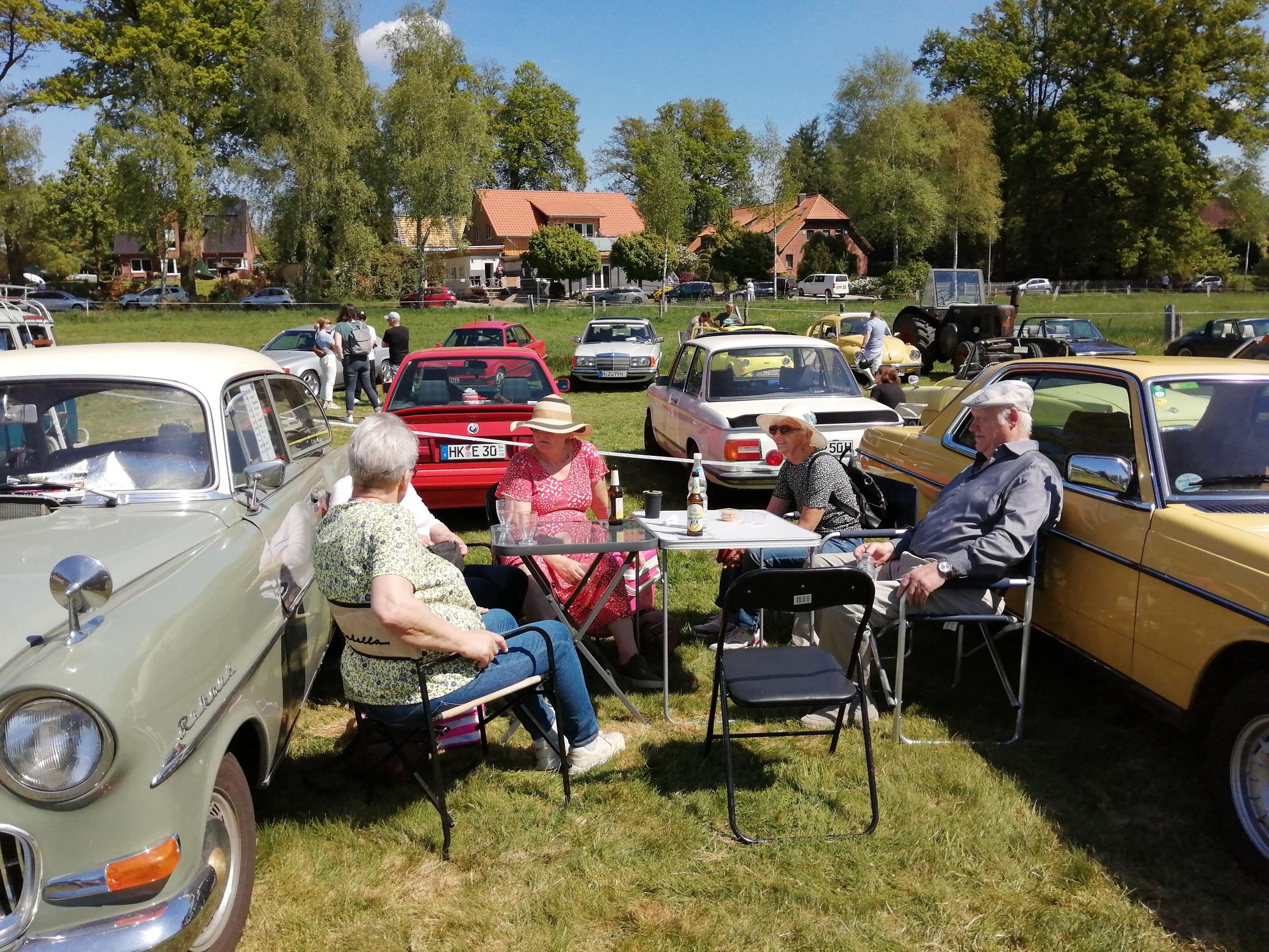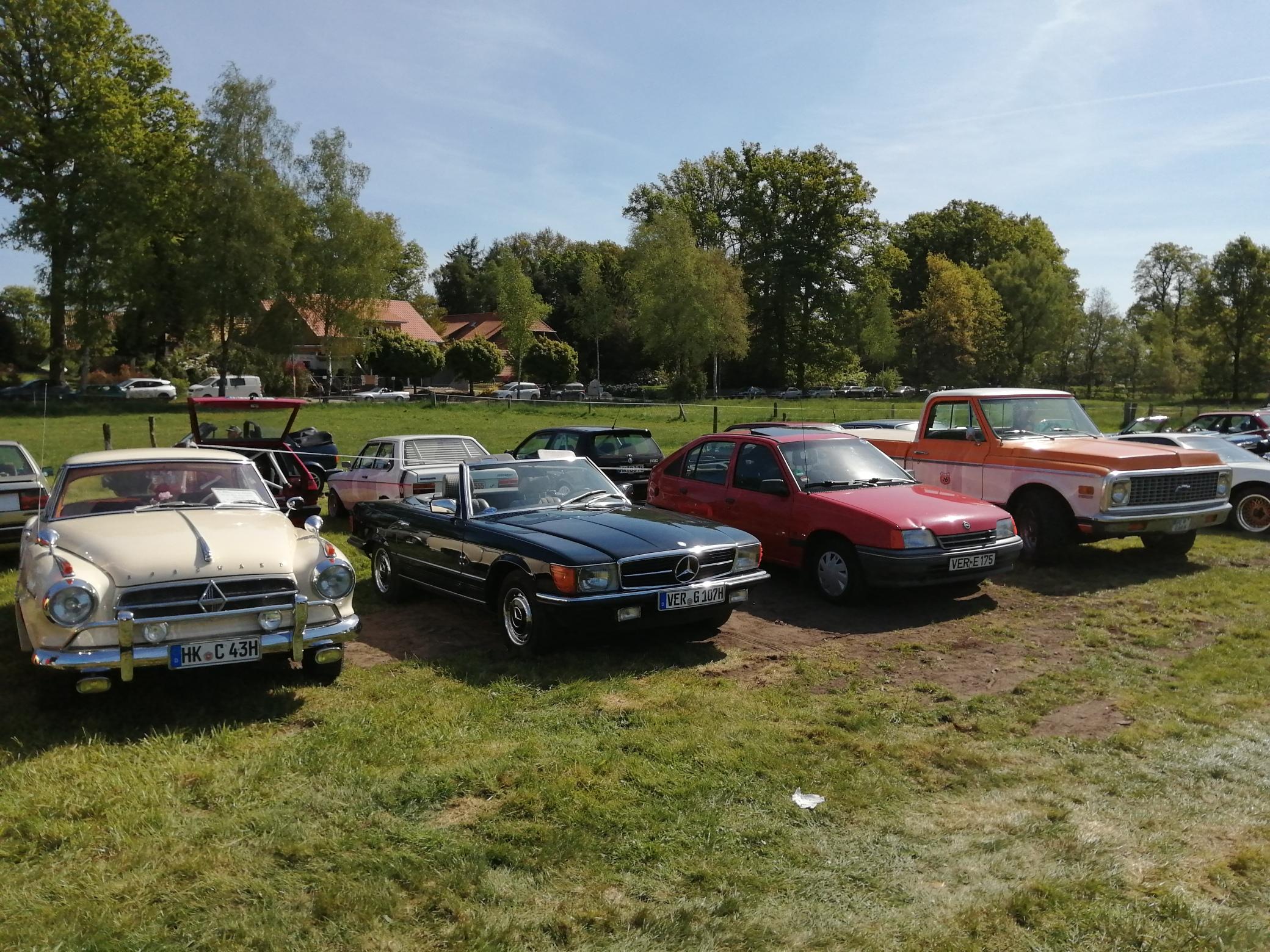 Am 1. Mai ging es, wie im Vorjahr wieder einmal nach Hünzingen zum Oldtimertreffen am Forellenhof. Wir trafen uns um 9.30 Uhr mit 4 Fahrzeugen und einem Gast im Gewerbegebiet in Lemke. Auf der Strecke nach Hünzingen kamen in Rethem nochmals drei Fahrzeuge und in Walsrode ein Auto dazu. In Hünzingen angekommen, wartete noch ein Auto auf uns, so das wir zusammen mit 9 Fahrzeugen in Hünzingen bei strahlendem Sonnenschein waren.