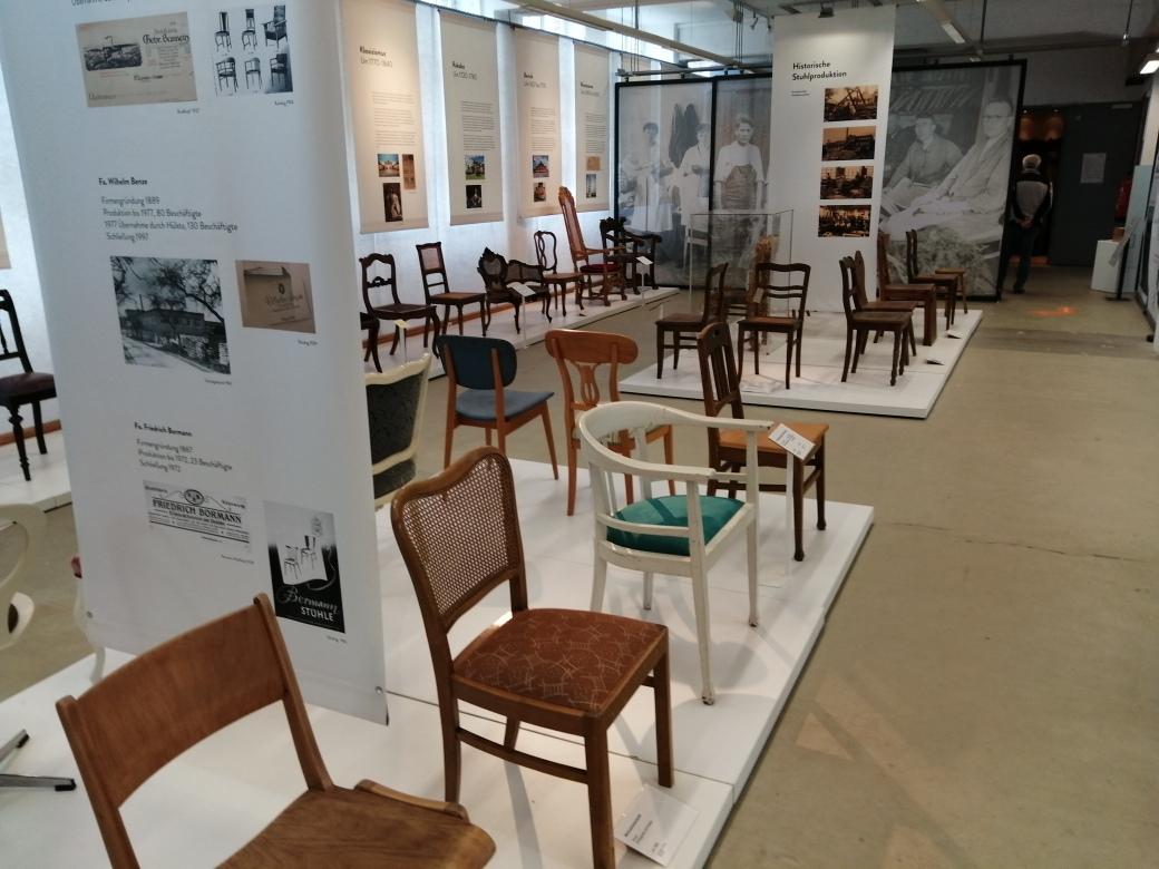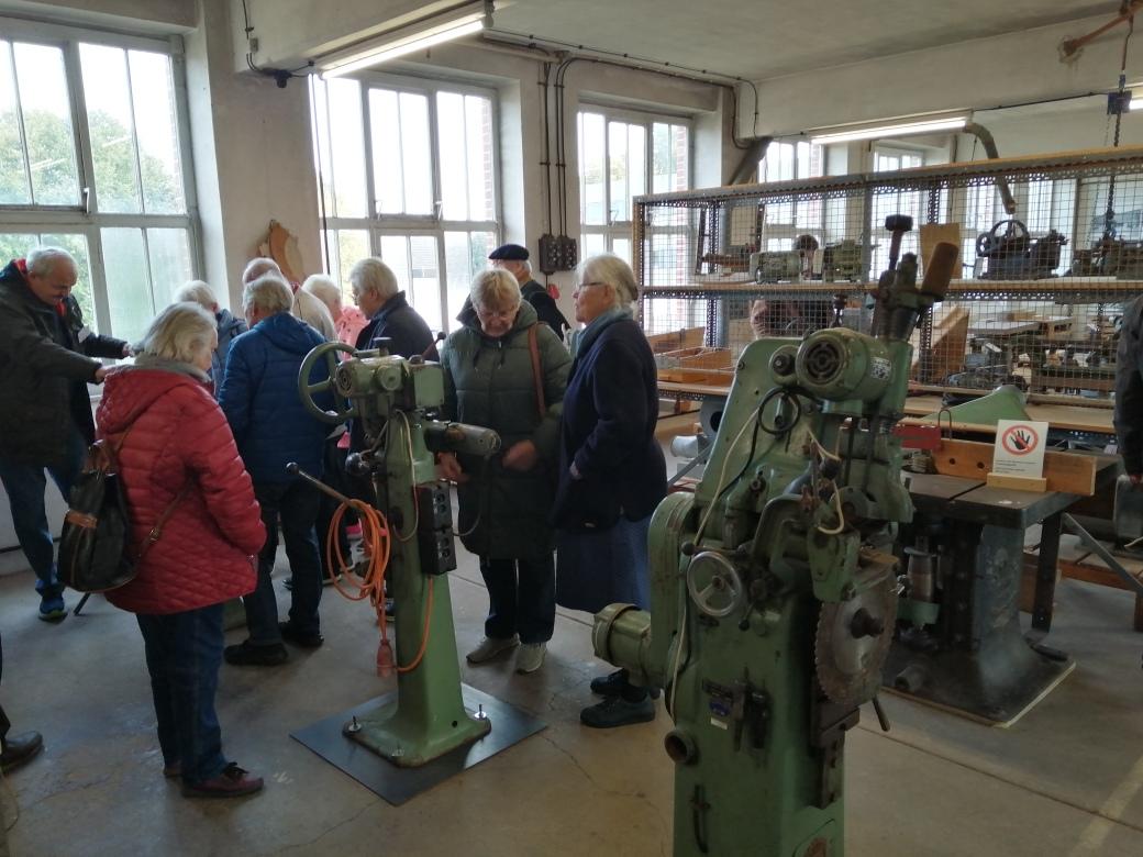 Nach dem Einparken unserer Fahrzeuge, wurden wir von zwei fachkundigen Personen in zwei Gruppen eingeteilt, die uns sehr viel über die ehemalige Stuhlfabrik in Eimbeckhausen und über die Maschinen zur Herstellung von Holzstühlen und dem anschließenden Zusammenbau der verschiedenen Arten erzählt haben.